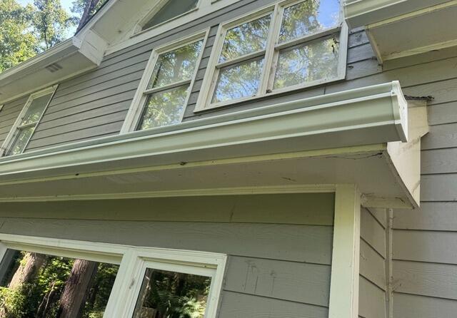 Before beginning the gutter removal and installation, Ariel carefully inspected the existing gutters, soffit, and fascia. This extra step ensures every system we install has a strong foundation. During the inspection, Ariel discovered that about 14 feet of fascia board needed replacement to properly support the new gutters. Frank also pointed out areas around the foundation where water overflow had been eroding the soil and damaging the landscaping.